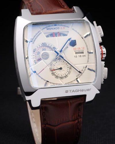 • Tag Heuer Monaco Brushed Stainless Steel Case White Dial Brown Leather Strap