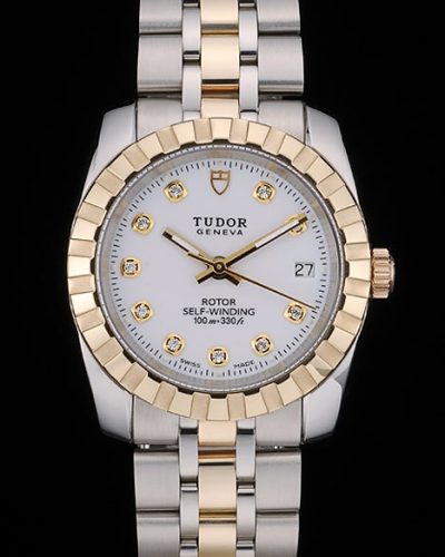 • Swiss Tudor Classic Rose Gold Ribber Bezel Crystal Encrusted White Dial 80301