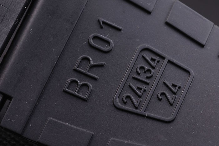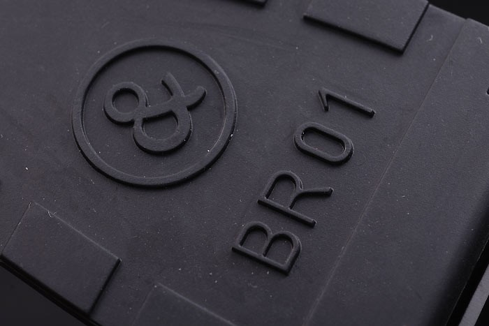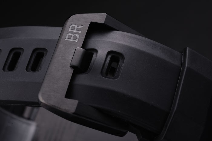 Bracelet: Black rubber strap with heat embossed logo, model number and product code and BR engraved ion-plated hook-buckle clasp