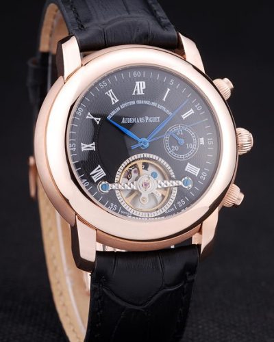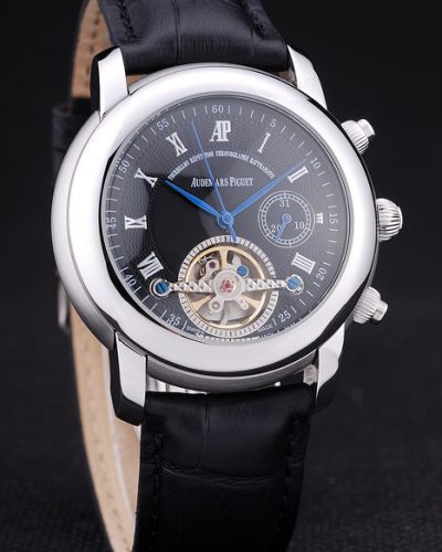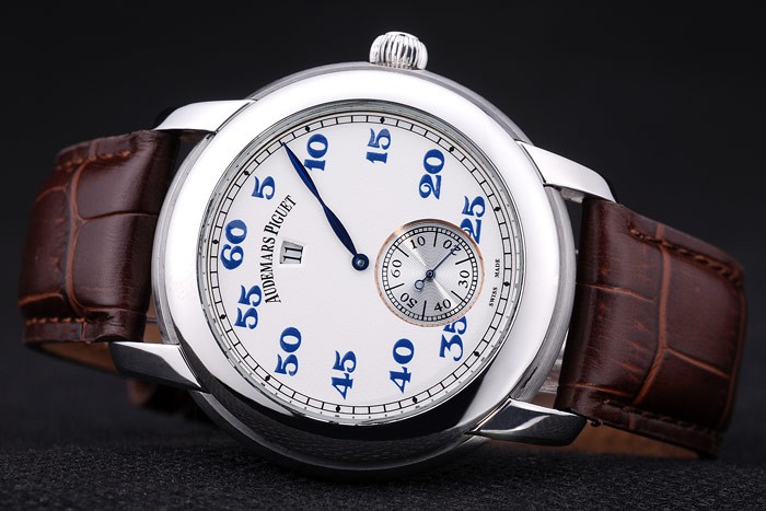 Bracelet: Brown crocodile leather strap with heat embossed Audemars Piguet Replica name and logo and an Audemars Piguet Replica inscribed stainless steel flip-over hook clasp