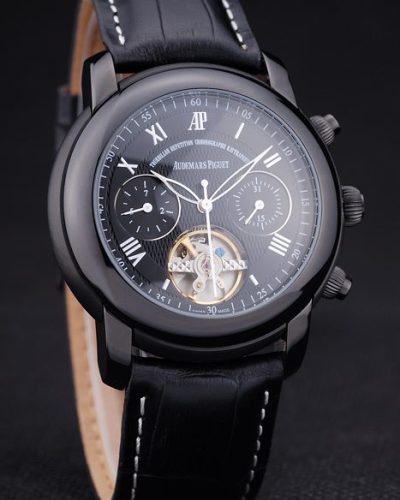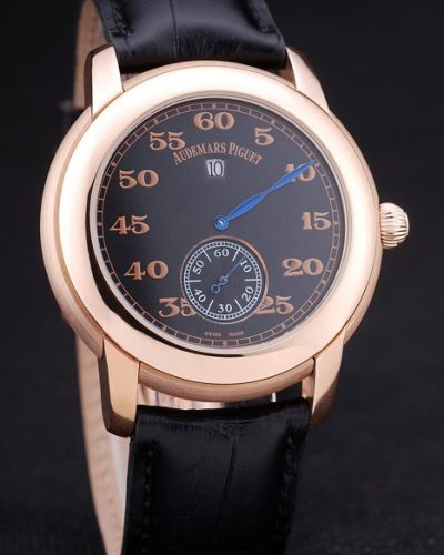 Bracelet: Black crocodile leather strap with heat embossed Audemars Piguet Replica name and logo and an Audemars Piguet Replica inscribed 18k rose-gold plated flip-over hook clasp
