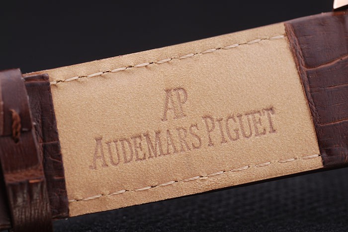 Bracelet: Brown crocodile leather strap with heat embossed Audemars Piguet Replica name and logo and an Audemars Piguet Replica inscribed 18k rose-gold plated flip-over hook clasp