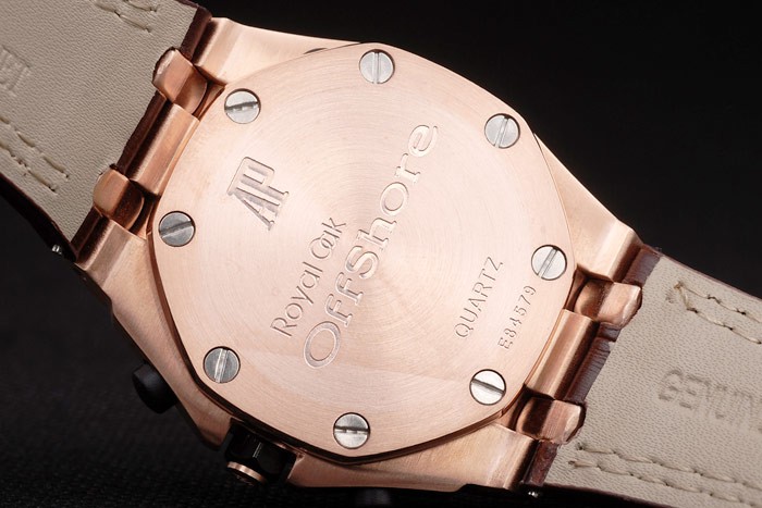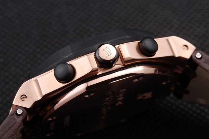 Back: Rose-gold plated screwed down back with Audemars Piguet Replica logo and engravings Gender: UominiMovement: Quarzo (Batteria) Quality: Giapponese Miyota Color: Marrone Case: Rose-gold plated case Bracelet: Heat embossed Audemars Piguet Replica dark brown crocodile leather strap with double white stitching and Audemars Piguet Replica engraved rose-gold plated fold-in clasp Bracelet Length: 220 x 25 mm Bezel: Ion-plated screwed down bezel Band Type: Pelle Diameter: 48 x 40 mm Chronograph: Si Watch Clasp: Flip Clasp Glass: Sapphire Crystal Crown: Ion-plated protected hexagonal crown with the initials AP on rose-gold stud plus a round crown on either side of it Case Thickness: 16 mm