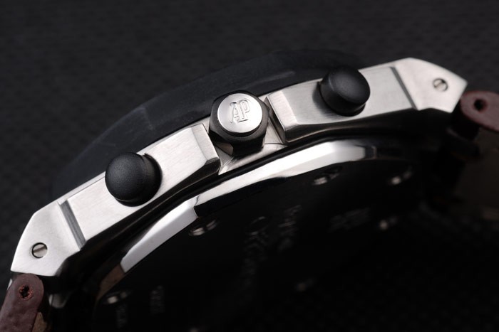 Back: Brushed stainless steel screwed down back with Audemars Piguet Replica logo and engravings Gender: UominiMovement: Quarzo (Batteria) Quality: Giapponese Miyota Color: Marrone Case: Brushed stainless steel case Bracelet: Heat embossed Audemars Piguet Replica brown crocodile leather strap with double white stitching and Audemars Piguet Replica engraved stainless steel fold-in clasp Bracelet Length: 220 x 25 mm Bezel: Ion-plated bezel screwed down by stainless steel screws Band Type: Pelle Diameter: 48 x 40 mm Chronograph: Si Watch Clasp: Flip Clasp Glass: Sapphire Crystal Crown: Ion-plated protected hexagonal crown with the initials AP on stainless steel stud plus a round crown on either side of it Case Thickness: 16 mm