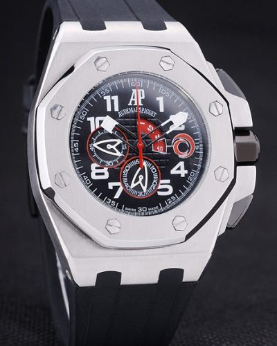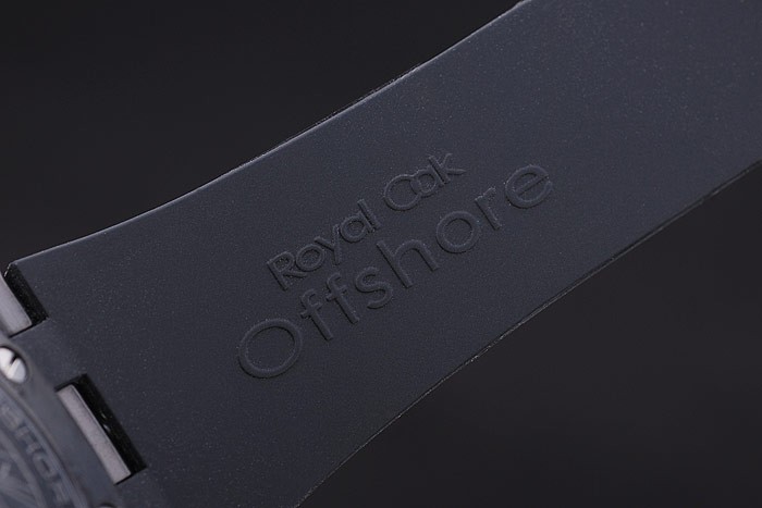 Bracelet: Black rubber strap with heat embossed Audemars Piguet Replica Royal Oak Offshore stamp and an Audemars Piguet Replica inscribed ion-plated hook-buckle clasp