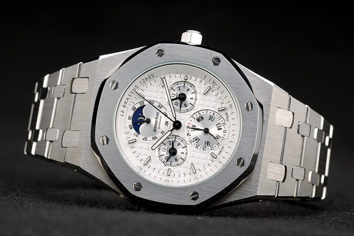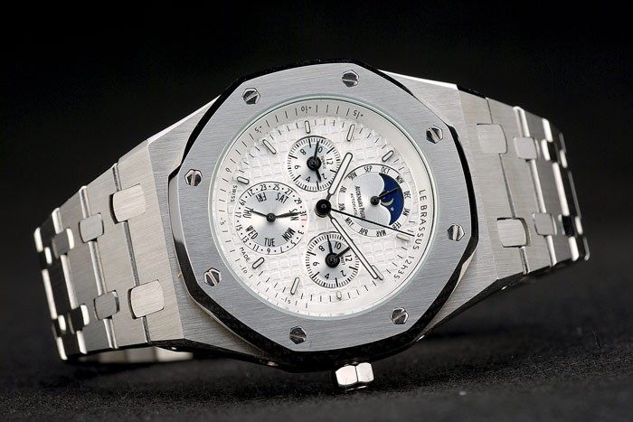 Back: Brushed stainless steel screwed down back with transparent center and Royal Oak Offshore engraving Gender: UominiMovement: Cinetico (Automatico) Quality: Giapponese Miyota Color: Argento Case: Brushed stainless steel case Bracelet: Brushed stainless steel link bracelet with AP engraving and push-button hidden clasp Bracelet Length: 165 x 25 mm Bezel: Octagonal brushed stainless steel screwed down bezel Band Type: Acciaio inossidabile Diameter: 40 x 49 mm Glass: Sapphire Crystal Crown: Stainless steel Audemars Piguet Replica logo engraved hexagonal crown Case Thickness: 13 mm