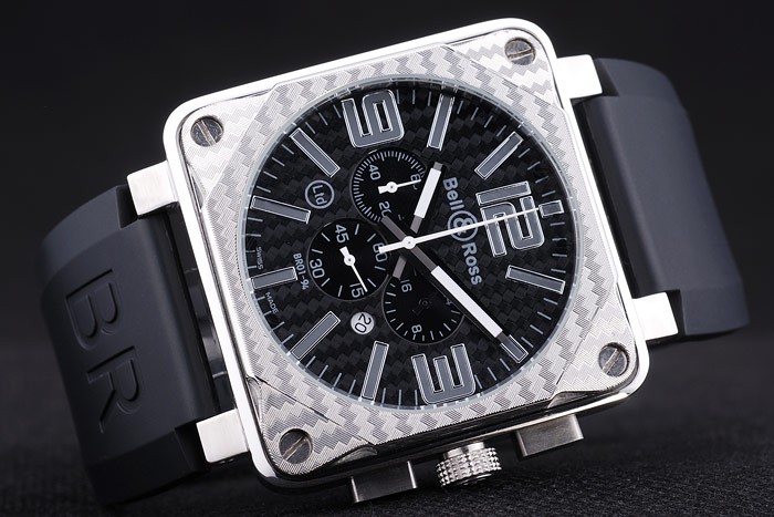 Bracelet: Heat embossed Bell & Ross Replica logo and product code black rubber strap with BR inscribed brushed stainless steel hook-buckle clasp