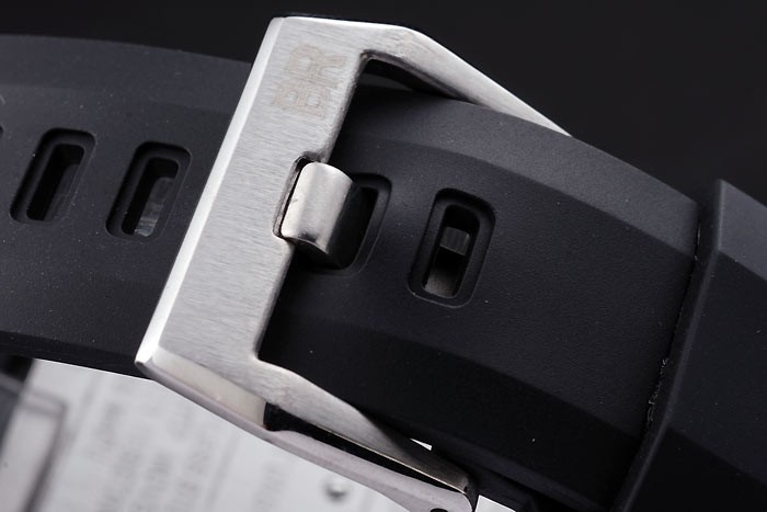 Bracelet: Black rubber strap with heat embossed logo, model number and product code and BR engraved brushed stainless steel hook-buckle clasp