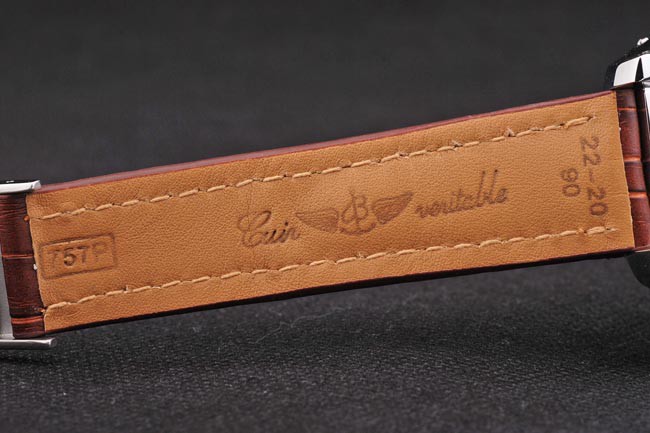 Bracelet: Warm mahogany colored high-grade leather in a crocodile pattern, with heavy white cotton stitching. Tan inner band is embossed with the Breitling Replica name and logo, and has a steel buckle closure.