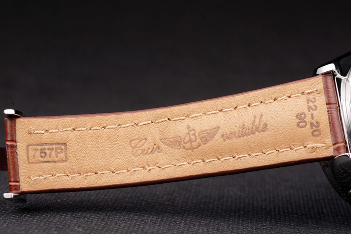 Bracelet: Brown crocodile leather strap with patent white stitching and heat embossed Breitling Replica engravings and engraved stainless steel fold in clasp with Breitling Replica logo on top