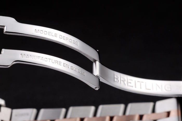 Bracelet: Polished stainless steel and rose-gold link bracelet with date and Breitling Replica engraved fold in clasp