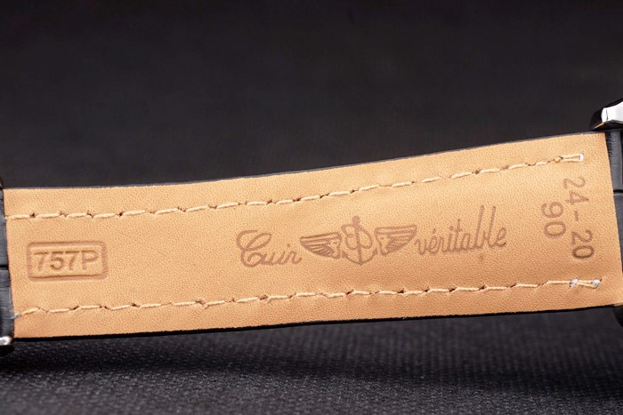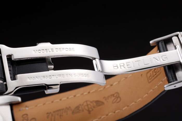 Bracelet: Black crocodile leather strap with patent white stitching and heat embossed Breitling Replica engravings and engraved stainless steel fold in clasp with Breitling Replica logo on top