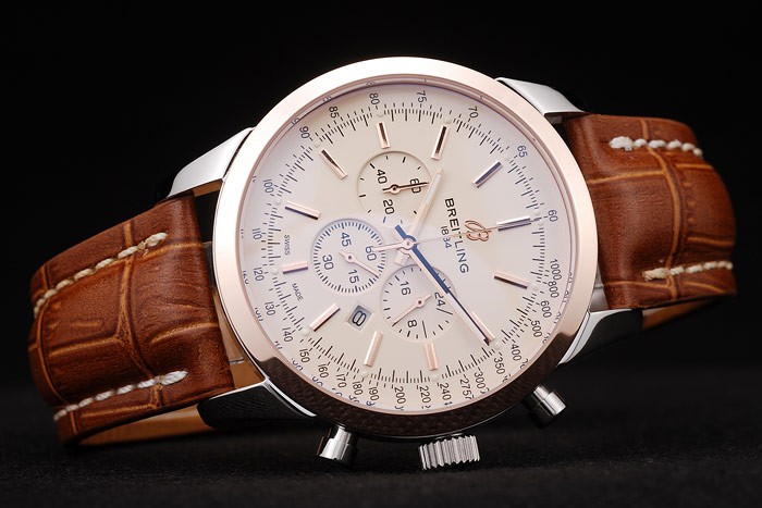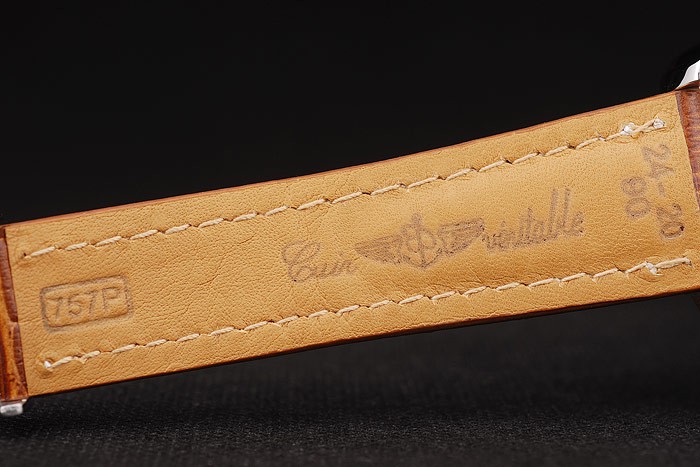 Bracelet: Heat embossed Breitling Replica brown crocodile leather strap with white thread stitching and a Breitling Replica logo engraved fold-in stainless steel clasp