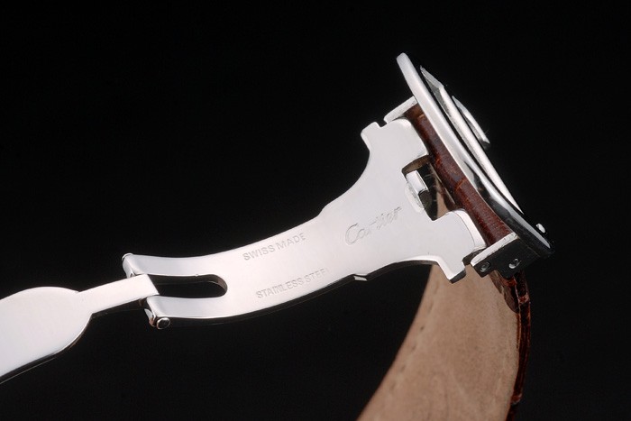Back: Brushed stainless steel screwed down back with Cartier Replica engravings Gender: DonneMovement: Quarzo (Batteria) Quality: Svizzera ETA Case: Polished stainless steel case Bracelet: Cartier Replica heat embossed brown crocodile leather strap with polished stainless steel fold-in buckle clasp Bracelet Length: 195 x 20 mm Bezel: Polished stainless steel bezel with integrated crown Diameter: 45 x 42 mm Glass: Sapphire Crystal Crown: Sapphire crystal stud stainless steel cutwork crown encased in a niche cut out into the bezel Case Thickness: 12 mm