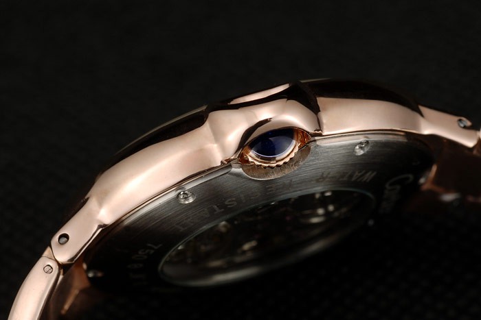 Crown: Sapphire crystal stud rose-gold plated cutwork crown encased in a small niche cutout as part of the bezel