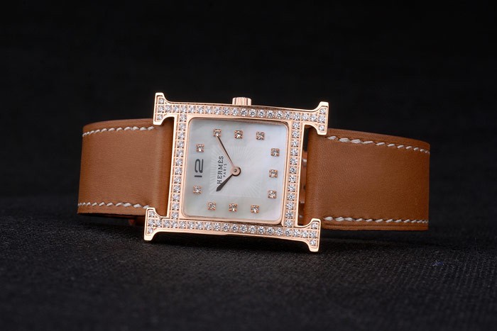 Back: 18k rose-gold plated screwed down back with Hermes Replica inscriptions Gender: DonneMovement: Quarzo (Batteria) Quality: Giapponese Miyota Case: 18k rose-gold plated stainless steel case Bracelet: Hermes Replica heat embossed tan leather strap with white thread stitching and Hermes Replica engraved 18k rose-gold plated hook-buckle clasp Bracelet Length: 190 x 20 mm Bezel: 18k rose-gold plated diamond encrusted H-logo bezel Band Type: Pelle Diameter: 36 x 26 mm Watch Clasp: Buckle Glass: Sapphire Crystal Crown: 18k rose-gold plated cutwork crown with Hermes Replica logo Case Thickness: 7 mm