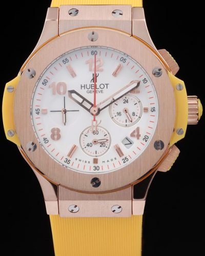 Bracelet: Textured white rubber band with rose-gold push-button hook clasp and Hublot Replica engravings
