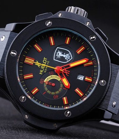 Bracelet: Heat embossed logo and Hublot Replica Geneve ribbed black rubber strap with Hublot Replica Geneve engraved fold-over rose-gold plated push-release hook clasp