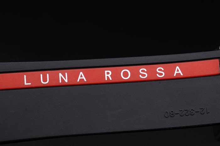 Bracelet: Textured black rubber band with stainless steel push-button hook clasp, heat embossed LUNA ROSSA engraving and Hublot Replica inscriptions