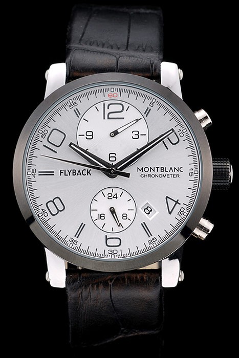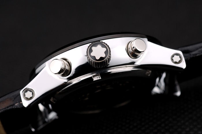 Crown: Ion-plated cutwork crown with MontBlanc Replica logo and two polished stainless steel push button crowns on either side of it