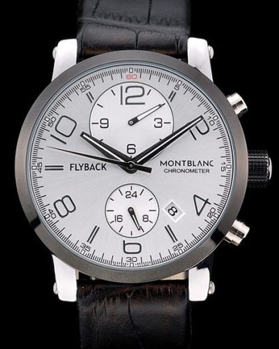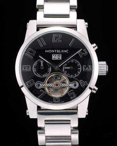 Crown: Polished stainless steel rounded cutwork crown with MontBlanc Replica logo and two polished stainless steel push button crowns on either side of it