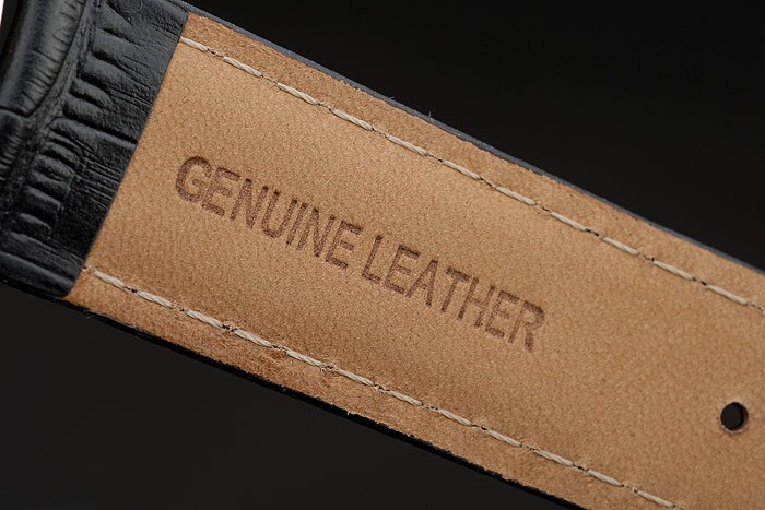 Bracelet: MontBlanc Replica heat embossed black crocodile leather strap with MontBlanc Replica and logo inscribed polished stainless steel hidden hook clasp