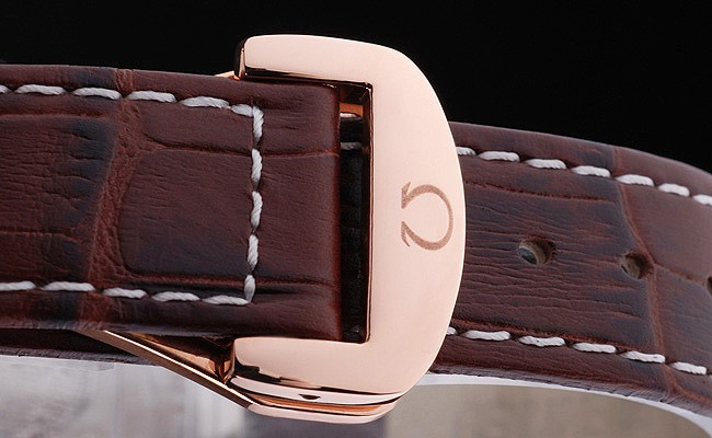 Bracelet: Brown crocodile leather strap with white stitching and Omega Replica logo engraved yellow gold hook-buckle clasp