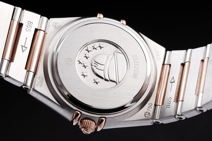 Back: Brushed stainless steel push-in back with engravings Gender: DonneMovement: Quarzo (Batteria) Quality: Svizzera ETA Case: Brushed stainless steel case Bracelet: Brushed stainless steel and rose-gold link chain bracelet with hidden clasp and Omega Replica logo on top Bracelet Length: 160 x 16 mm Bezel: Rose-gold bezel with black Roman number hour markers Band Type: Acciaio inossidabile Diameter: 26 x 25 mm Watch Clasp: Flip Clasp Glass: Sapphire Crystal Crown: 18k rose-gold cutwork crown with Omega Replica logo Case Thickness: 8 mm