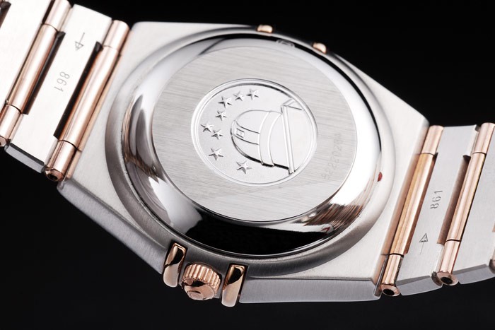 Back: Brushed stainless steel push-in back with engravings Gender: UominiMovement: Quarzo (Batteria) Quality: Svizzera ETA Case: Brushed stainless steel case Bracelet: Brushed stainless steel and rose-gold link chain bracelet with hidden clasp and Omega Replica logo on top Bracelet Length: 180 x 22 mm Bezel: Rose-gold bezel with black Roman number hour markers Band Type: Acciaio inossidabile Diameter: 37 x 34 mm Watch Clasp: Flip Clasp Glass: Sapphire Crystal Crown: 18k rose-gold cutwork crown with Omega Replica logo Case Thickness: 11 mm