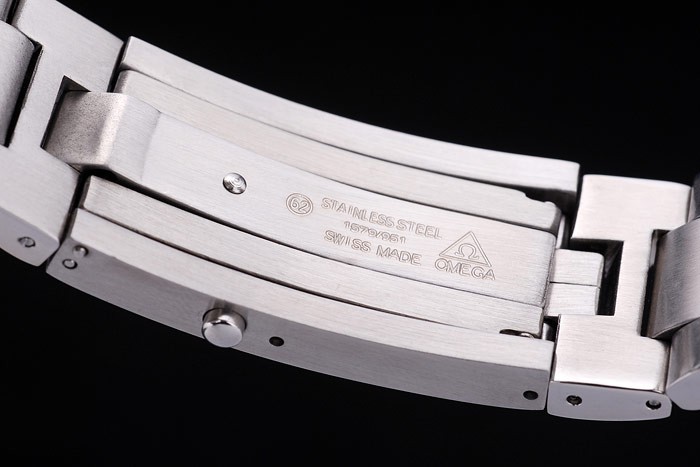Crown: Polished stainless steel cutwork crown with Omega Replica logo plus another similar crown on the opposite top corner