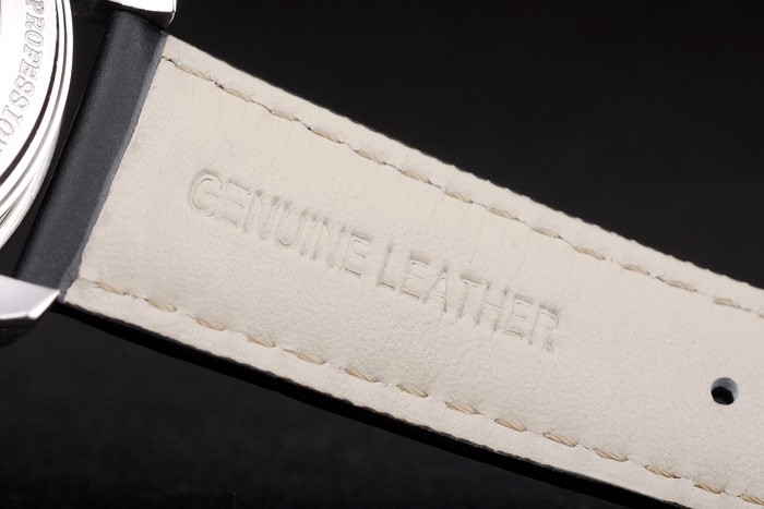 Bracelet: Orange stitched black leather strap with heat embossed Omega Replica stamp and polished stainless steel fold-in clasp with Omega Replica logo on top