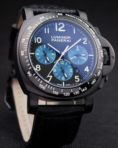 Bracelet: Black crocodile leather strap with white stitching and heat embossed Luminor Panerai Replica stamp and ion-plated stainless steel hook-buckle clasp with Panerai Replica engraving