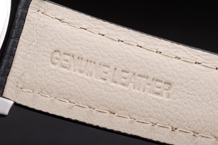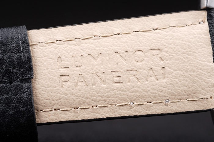 Bracelet: Black leather strap with white stitching and heat embossed Luminor Panerai Replica stamp and brushed stainless steel hook-buckle clasp with Panerai Replica engraving