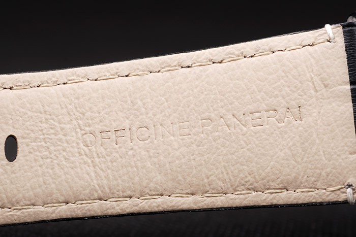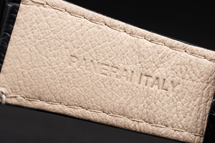 Bracelet: Black crocodile leather strap with white stitching and heat embossed Officine Panerai Replica Italy stamp and ion-plated hook-buckle clasp with Panerai Replica engraving