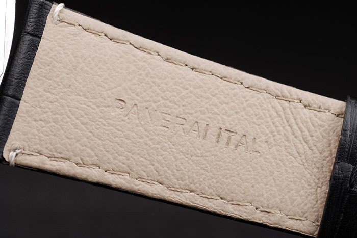 Bracelet: Black crocodile leather strap with white stitching and heat embossed Officine Panerai Replica Italy stamp and brushed stainless steel hook-buckle clasp with Panerai Replica engraving