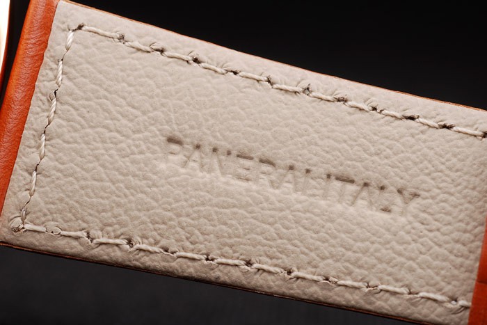 Bracelet: Brown leather strap with white stitching and heat embossed Officine Panerai Replica Italy stamp and 18k rose-gold plated hook-buckle clasp with Panerai Replica engraving