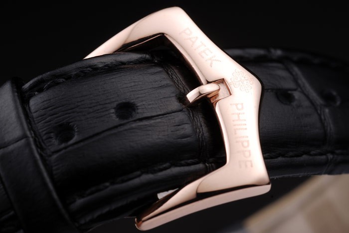 Bracelet: Black crocodile leather strap with heat embossed Patek Philippe Replica stamp and 18k rose-gold plated hook-buckle clasp with Patek Philippe Replica engraving