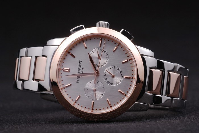Bracelet: Polished stainless steel and rose gold link bracelet with hidden clasp and Patek Philippe Replica marking