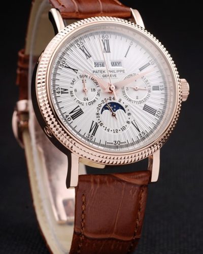 Back: Stainless steel rimmed transparent snap-in back with Patek Philippe Replica Geneve inscription Gender: UominiMovement: Cinetico (Automatico) Quality: Giapponese Miyota Color: Marrone Case: 18k rose-gold plated case Bracelet: Brown crocodile leather strap with heat embossed Patek Philippe Replica stamp and 18k rose-gold plated hook-buckle clasp with Patek Philippe Replica engraving Bracelet Length: 205 x 22 mm Bezel: 18k rose-gold plated bezel Band Type: Pelle Diameter: 53 x 42 mm Watch Clasp: Buckle Glass: Sapphire Crystal Crown: 18k rose-gold plated cutwork crown with Patek Philippe Replica logo and rectangular push button crowns on either side of it Case Thickness: 13.5 mm