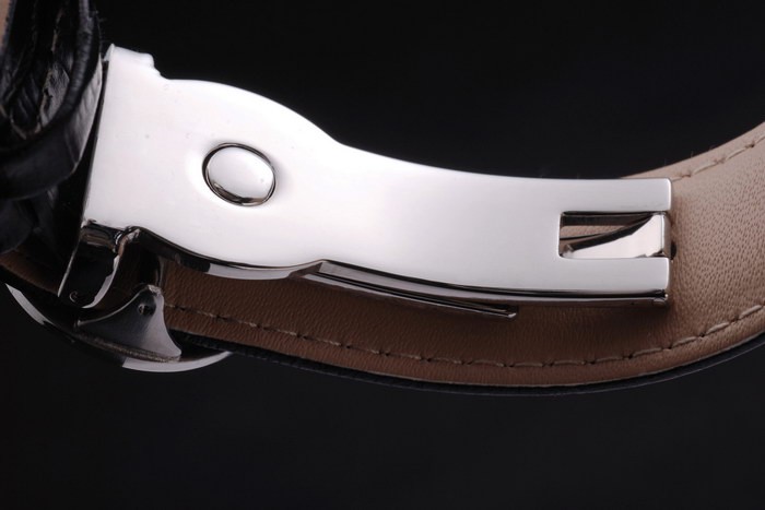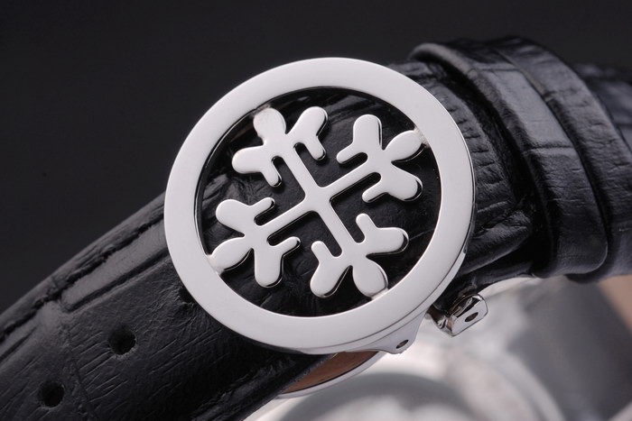 Bracelet: Black leather strap with Patek Philippe Replica stamp and a stainless steel fold in clasp with a Patek logo buckle