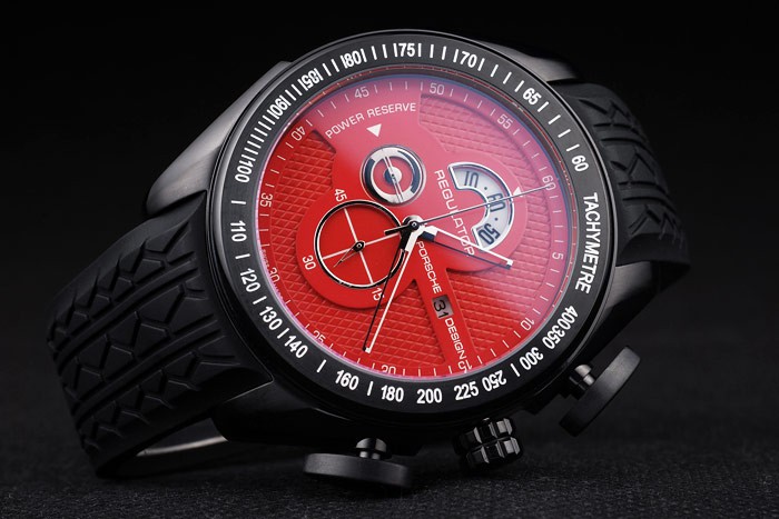 Bracelet: Tyre-groove black rubber strap with heat embossed Porsche Replica stamp and ion-plated hook-buckle clasp with Porsche Replica inscription