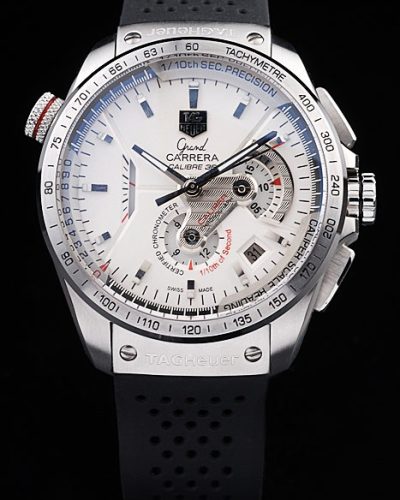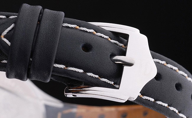 Bracelet: Textured white leather strap with heat embossed Monaco stamp and Tag Heuer Replica engraved hook-buckle clasp