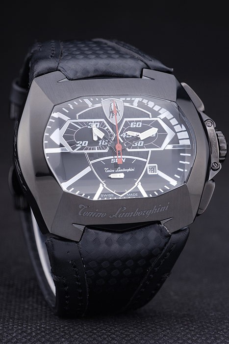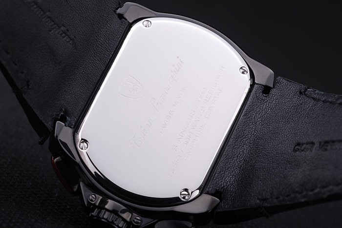 Bracelet: Black leather strap with heat embossed Tonino Lamborghini Replica stamp and Tonino Lamborghini Replica engraved and logo embossed ion-plated fold-in flip-over hook clasp