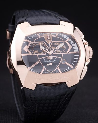 Bracelet: Black leather strap with heat embossed Tonino Lamborghini Replica stamp and Tonino Lamborghini Replica engraved and logo embossed ion-plated fold-in flip-over hook clasp