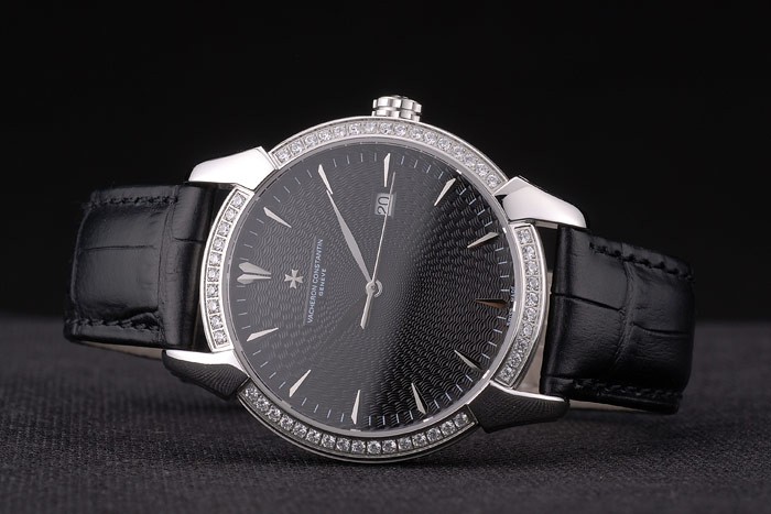 Bracelet: Heat embossed Vacheron Constantin Replica and logo black crocodile leather strap with polished stainless steel logo hook-buckle clasp