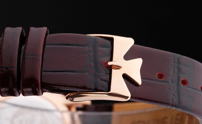 Bracelet: Rich maroon crocodile leather strap with ‘Vacheron Constantin Replica’ inscription and hook buckle clasp
